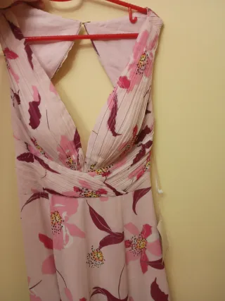 Vestido de fiesta con un bonito estampado floral en tonos rosas y burdeos. Ideal para eventos especiales. - Diseño con escote pronunciado. - Detalle de pliegues en la cintura. - Espalda con abertura. - Tejido ligero y vaporoso. La marca no corresponde con la puesta porque no tiene marca.