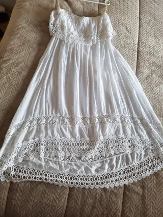 Vestido blanco estilo ibicenco, sin tirantes. Talla única. Escote elástico palabra de honor. Axila a axila y cintura elástico de 38cm a 46cm Largo delante 88cm largo detrás 113cm Crea lotes y ahorra. Solo pagas un envío. - Diseño con volantes en el escote. - Detalle de encaje en el corpiño y en el bajo. - Falda larga y fluida.