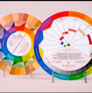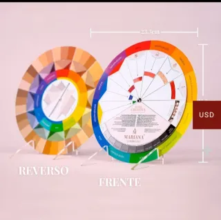 Herramienta de color y maquillaje de Mariana Zambrano. Permite explorar mezclas de colores y sugerencias de maquillaje. - Rueda de colores con escala de valor. - Sugerencias de maquillaje y subtonos de piel. - Incluye figuras geométricas para combinaciones. Rueda creativa de color y maquilla de Mariana Zambrano para combinar colores de manera práctica. Se puede utilizar de manera profesional y en automaquillaje. Cuenta con todos los principios de la teoría del color