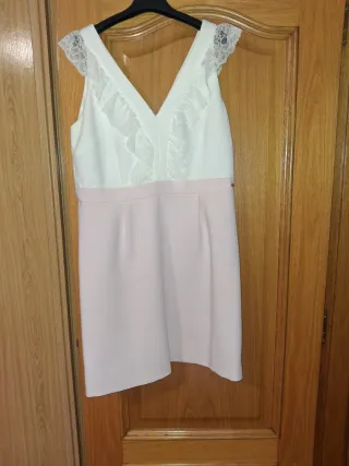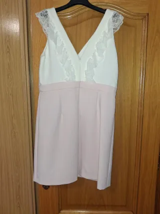 Vestido elegante de dos tonos, blanco en la parte superior y rosa en la inferior. Presenta detalles de encaje en los hombros y volantes en el escote. - Diseño sin mangas. - Escote en V con volantes. - Adornos de encaje en los hombros. Talla 42. Ideal para comuniones, bautizos...
