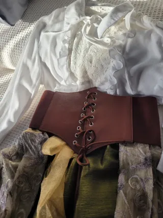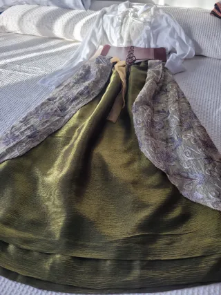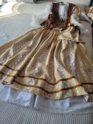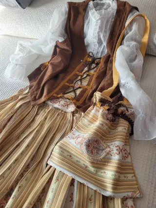 Conjunto de vestimenta de época, ideal para recreaciones históricas o fiestas temáticas. - Falda larga con estampado de rayas y motivos florales. - Chaleco marrón con pasamanería - Blusa blanca con volantes.y encaje - Adornos dorados en la falda. - Incluye un pequeño bolso a juego. se adapta a varias tallas por su confección, 42 44,46, ,no encontrarás otro igual porque está hecho en casa
