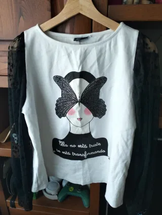 Camiseta de manga larga con un diseño único. - Mangas de tul negro con estrellas. - Estampado frontal de una mujer con mariposas. - Frase Ella no está triste, se está transformando en la parte inferior del estampado. Medida ancho sisa 55cm , largo 56cm