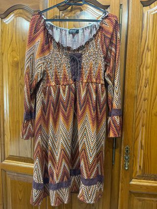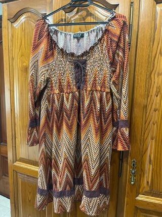 Vestido de manga larga con un estampado geométrico y tribal en tonos marrones y ocres. Ideal para la temporada de invierno. - Diseño con escote en pico. - Estampado étnico multicolor.