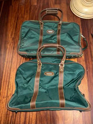 Conjunto de dos maletas vintage marca Samsonite de color verde clásico con asas y ribetes marrones. Maletas duraderas y ligeras, en perfecto estado. Tiene el logotipo de Samsonite visible en la parte delantera de ambas bolsas. Cuentan con asas superiores de cuero para facilitar el transporte, el cierre de velcro esta perfecto. Las cremalleras funcionan correctamente. Son una maleta portatrajes de tres bolsillos y otra de un bolsillo grande. Medidas (cm): Maleta de 3 bolsillos: 55 x 35 x 17 Maleta de 1 bolsillo: 48 x 32 x 27