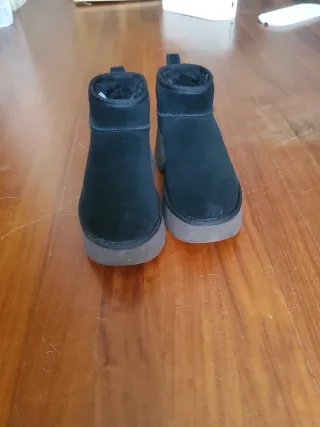 Botas UGG de caña baja con suela imitando tacón. Se han puesto solo 3 veces, están prácticamente nuevas. - Exterior de ante. - Forro interior cálido. - Detalle de tiradores en la parte trasera. No pesan