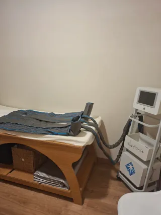 Pantalones diseñados para sesiones de presoterapia. Cuentan con un cierre de cremallera a lo largo de las piernas. - Diseño con múltiples cámaras de aire. - Cremalleras azules. - Logotipo de la marca visible.