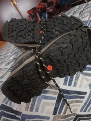 Botas de senderismo con suela de goma. - Diseño robusto. - Cordones negros con detalles verdes. - Detalle naranja en la suela.