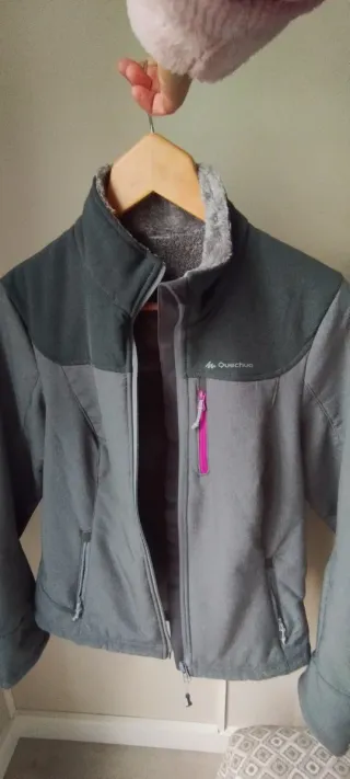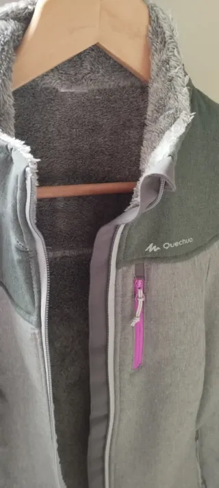 Chaqueta de senderismo Quechua. XS - Diseño bicolor en grises. - Cuello alto con forro interior. Muy calentita. - Cremallera frontal con detalle fucsia. - Bolsillos laterales con cremallera. -Valida para mujer, chica o niña. -Diseño atemporal.