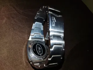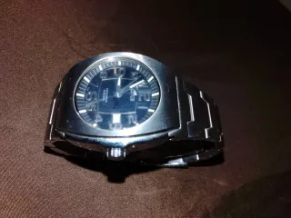 Elegante reloj de pulsera con un diseño moderno y sofisticado. - Esfera de color azul profundo. - Correa de eslabones plateados. - Resistente al agua hasta 50 metros.
