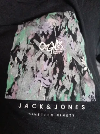Camiseta de manga corta con estampado frontal. - Diseño con estampado abstracto en tonos verdes, morados y blancos. - Logo de la marca Jack & Jones y el año Nineteen Ninety en la parte inferior del estampado.