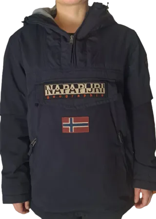 Chaquetón estilo Rainforest de Napapijri en color azul marino. Diseño moderno y funcional. - Capucha integrada. - Bolsillo frontal con cremallera. - Parche con logo en la parte delantera. - Bandera de Noruega en parche.