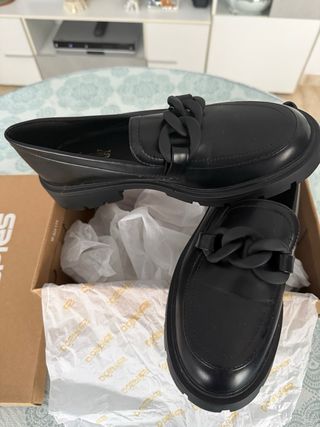Zapatos de mujer nuevos a estrenar con un diseño moderno. - Detalle de cadena en la pala. - Suela gruesa y cómoda. - Acabado liso.