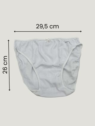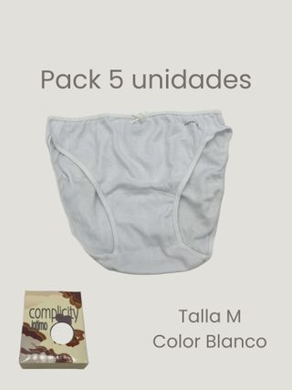 Pack de 5 unidades de braguita clásica de algodón. Talla M. Color blanco. 29,5 cm de ancho de cintura y 26 cm de largo. Completamente nuevas, se envía en su caja original. Composición: 95% algodón 5% elastano.