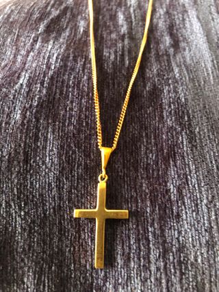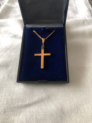 Elegante cruz chapada en oro, perfecta para complementar cualquier atuendo. Viene con una delicada cadena. - Mide 3,2x2,2 cm+gancho - La cadena mide 48 cm - Diseño de cruz clásica. - Acabado brillante chapado en oro. - En su caja - Se envía por Wallapop