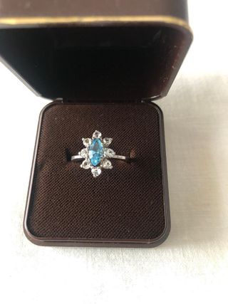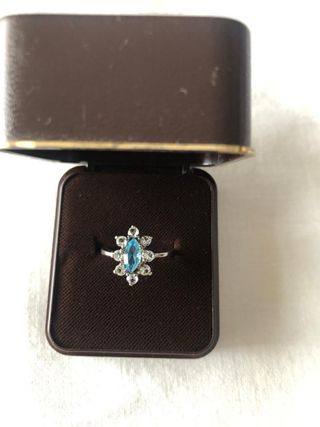 Elegante anillo de plata con un diseño central de agua marina y circonitas a su alrededor. - Diseño tipo flor. - Mide 1,6 cm de interior. Se envía por Wallapop