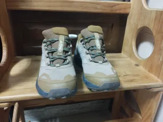 Zapatillas deportivas Adidas Terrex en tonos beige y marrón. - Diseño moderno y funcional. - Detalle de las tres franjas características de Adidas. - Marca Terrex visible en el lateral. Talla 43 1/3 Usadas una sola vez Venta por equivocación de talla