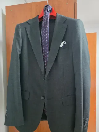 Traje de dos piezas de la marca Miguel Peris. - Chaqueta con dos botones. - Bolsillos frontales con solapa. - Puños con detalles. - Pantalón a juego. - Funda incluida -Precio negociable