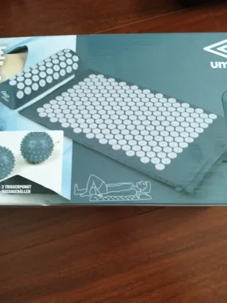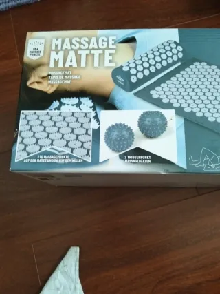 Esterilla de masaje con múltiples puntos de acupresión para relajación. - 264 puntos de masaje en la esterilla. - 54 puntos de masaje en la almohada. - Incluye 2 bolas de masaje. - Diseño en color gris.