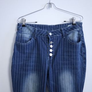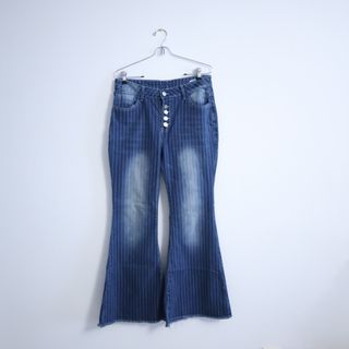 Pantalón vaquero de corte acampanado con un diseño de rayas verticales. - Diseño de rayas blancas. - Cierre de botones. - Estilo flare.