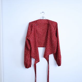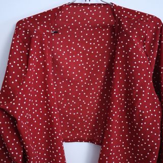 Bolero elegante con un estampado de puntos blancos sobre fondo rojo. Perfecto para añadir un toque especial a cualquier atuendo. - Diseño de bolero. - Estampado de puntos. - Cierre con lazos.