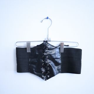 Este cinturón estilo corsé añade un toque distintivo a cualquier atuendo. - Diseño frontal con cordones. - Paneles laterales elásticos para un ajuste cómodo. - Material con acabado brillante.