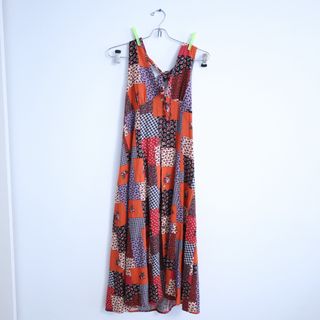 Vestido largo con un diseño patchwork de estampados florales y geométricos. Es una prenda llamativa y con un estilo único. - Diseño patchwork. - Estampado floral y geométrico. - Largo hasta los tobillos.