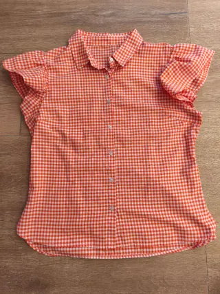 Camisa de manga corta con estampado de cuadros Vichy en tonos rojos y blancos. Presenta cuello camisero y cierre de botones. - Diseño de cuadros Vichy. - Manga corta con volante. - Cuello camisero. - Cierre de botones.