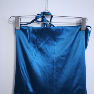Elegante vestido largo de fiesta en un llamativo tono azul. - Diseño de tirantes halter. - Tejido satinado brillante. - Corte recto y fluido.