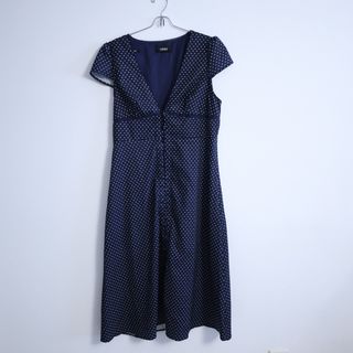 Vestido azul con estampado de lunares blancos. - Diseño con escote en V. - Mangas cortas. - Largo midi.