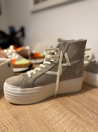 Zapatillas altas de la marca MIM. - Color gris con detalles blancos. - Suela blanca gruesa. - Cierre con cordones.