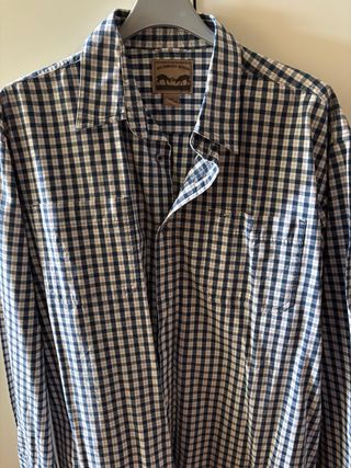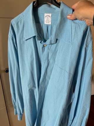 Camisa de vestir Brooks Brothers con un diseño de cuadros celestes y blancos. Es el modelo Regent, la camisa polo original. - Talla XXL. Mide de sisa a sisa 70 cm. Es como una 4 o 5 XL. - Tejido 100% algodón. - Fabricada en China.