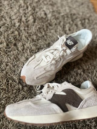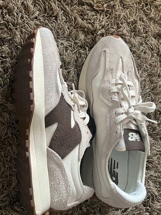Zapatillas New Balance 327 en tonos beige y marrón. Usadas solo una vez y conservadas en su caja original. Talla 47,5 - Diseño moderno y cómodo. - Detalles en gamuza y tejido técnico. - Suela de goma para mayor agarre.