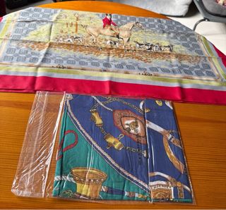 Elegantes pañuelos con diseños únicos. - Un pañuelo presenta una escena de caza con jinetes y perros. - El otro pañuelo tiene un estampado de cadenas y elementos dorados sobre fondo azul y verde. Los dos 3€