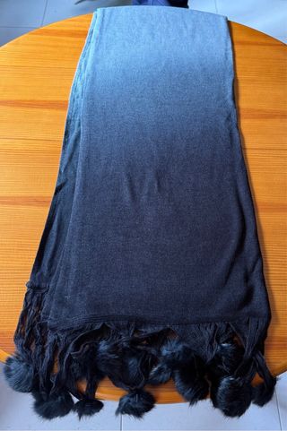 Bufanda suave con un diseño degradado de gris a negro. Los extremos están adornados con flecos y pompones de pelo sintético. - Diseño ombré. - Flecos decorativos. - Pompones de pelo sintético.