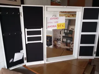 Joyero de madera con un diseño elegante y funcional. - Puertas abatibles con espejo. - Interior forrado en tela negra. - Compartimentos para organizar joyas y accesorios.