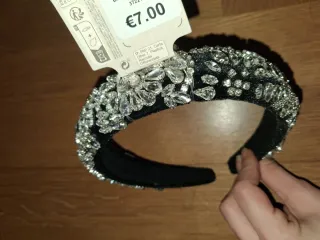 Diadema de terciopelo negro adornada con pedrería plateada. - Diseño elegante y llamativo. - Aporta un toque de brillo a cualquier look. - Ideal para ocasiones especiales.