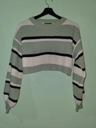 Jersey corto con un diseño de rayas horizontales en varios colores. Es una prenda cómoda y versátil. - Tejido de punto. - Manga larga. - Corte cropped.