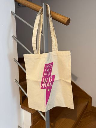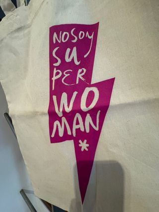 Bolsa de tela de la marca Malasmadres con un diseño reivindicativo. - Mensaje No soy Superwoman con un rayo rosa. - Asas de tela resistentes. - Color beige. - Composición: 100% algodón - Tiene una pequeña mancha que se ve en la última foto.