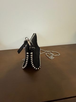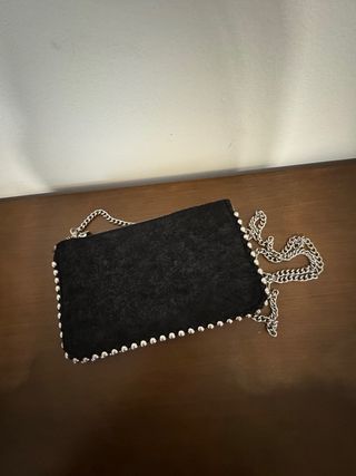 Elegante bolso negro de Zara con un diseño moderno y detalles metálicos. - Adornado con tachuelas plateadas alrededor del borde. - Cadena plateada para llevar al hombro o cruzado.
