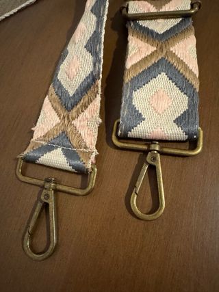 Correa de repuesto para bolso con un bonito diseño. - Tejido resistente con patrón geométrico. - Hebillas y mosquetones metálicos en tono dorado.