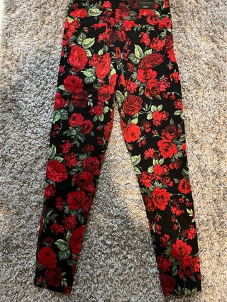 Pantalón pitillo con estampado floral. - Diseño ajustado. - Estampado de rosas rojas sobre fondo negro.