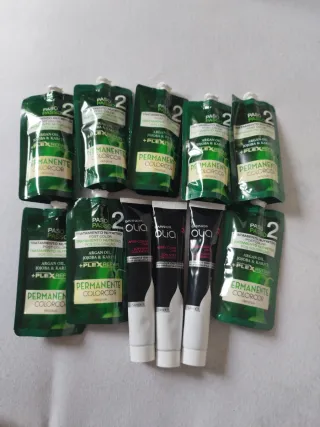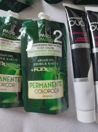 Lote de tratamientos nutritivos para después de la coloración del cabello/pelo. - Contiene 11 unidades. - Fórmula con aceite de argán, jojoba y karité (8) de la marca deliplus y (3) de la marca Garnier. - Nuevos, sin desprecintar. - Ayuda a reparar y proteger el cabello teñido. ***Hago lotes de productos, ropa en un sólo envío, consulta mi perfil y hablamos.