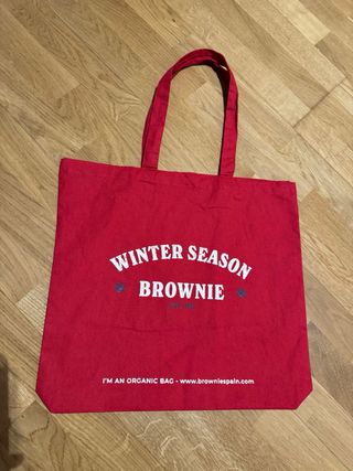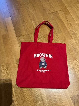 Bolsa de tela con estampado de oso y texto. - Diseño Brownie Winter Season Estd. 2006. - Color rojo vibrante. - Asas resistentes para llevar cómodamente.