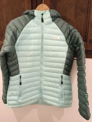 Chaqueta acolchada The North Face para mujer, con un diseño bicolor. - Mangas y paneles laterales en tono verde oscuro. - Cuerpo principal en color verde agua. - Capucha integrada. - Cremallera frontal completa. - Bolsillos laterales con cremallera.