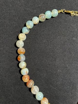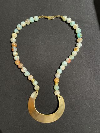 Elegante collar con cuentas de colores variados y un llamativo colgante. - Cuentas de piedra natural con tonos celestes, blancos, naranjas y marrones. - Colgante en forma de U de metal dorado. - Cierre de mosquetón con cadena de extensión.