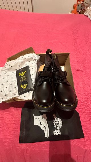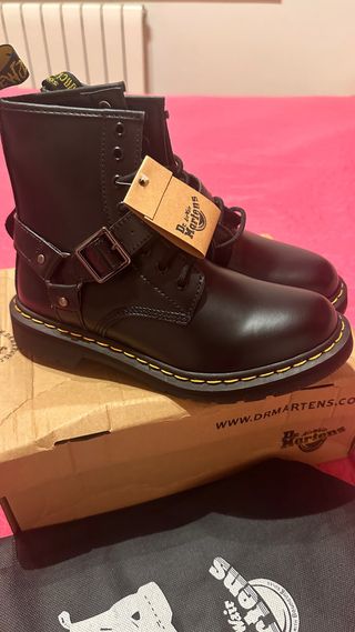 Botas estilo 1460 de Dr. Martens. - Diseño clásico de caña alta. - Detalle de hebilla y correa. - Cordones para ajuste. - Costuras amarillas icónicas. - Incluye gamuza de limpieza