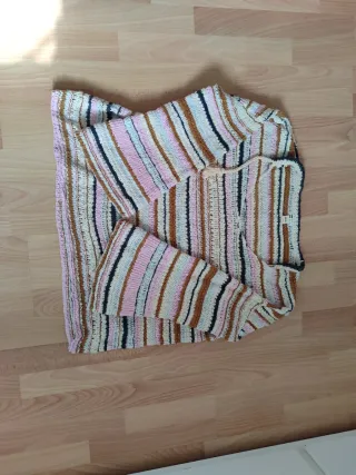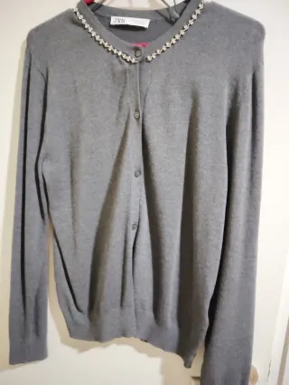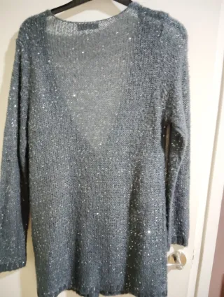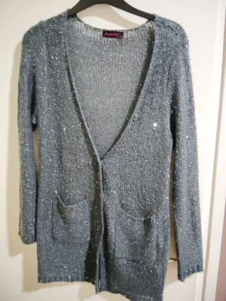 Elegante abrigo de punto con detalles brillantes. Perfecto para añadir un toque de luz a tus conjuntos. - Tejido de punto fino. - Diseño abierto con botones. - Dos bolsillos delanteros.