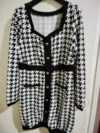 Vestido con estampado clásico de pata de gallo. - Diseño de manga larga. - Cuello cuadrado. - Detalle de botones dorados. - Bolsillos frontales.