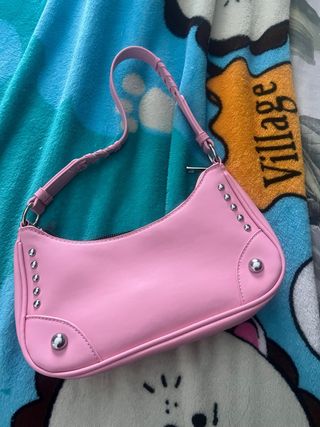Bolso de mano en color rosa con un diseño moderno y detalles metálicos. - Acabado en piel sintética. - Tachuelas plateadas decorativas. - Asa trenzada.