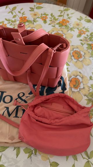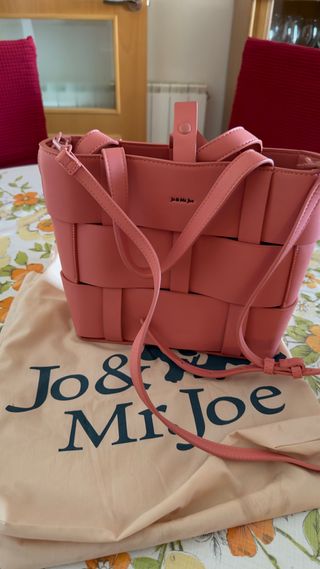 Bolso de mano y hombro de la marca Jo & Mr Joe, con un diseño tejido muy actual. - Color rosa y beige. - Asa corta y correa larga ajustable. - Cierre con botón a presión. -Nunca usado